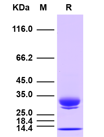 理論分子量為22.0kDa,由于糖基化,SDS-PAGE還原電泳分子量大小為35-45kDa。