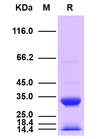理論分子量為32.1kDa和11.7kDa,由于糖基化,SDS-PAGE還原電泳分子量大小為34kDa和12kDa。